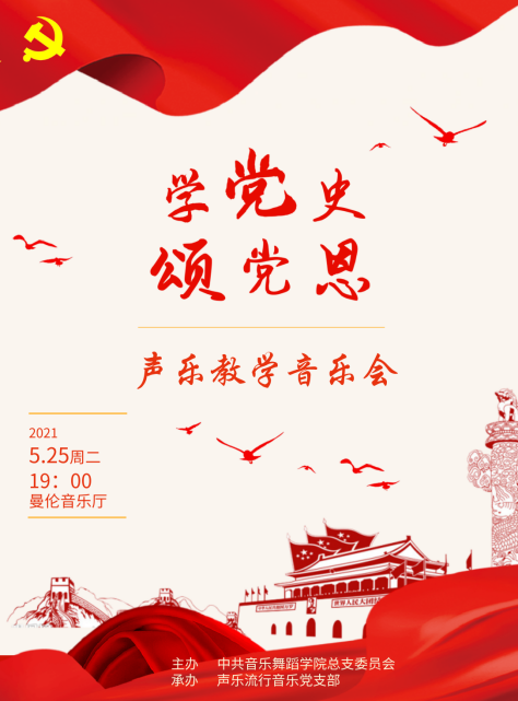 2021年5月25日晚7:00,由中共音乐舞蹈学院总支委员会主办,声乐流行音乐党支部、声乐教研室承办的“学党史 颂党恩”声乐教学音乐会在曼伦音乐厅举行。