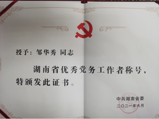 院党委书记邹华秀荣获湖南省2021年度优秀党务工作者