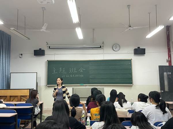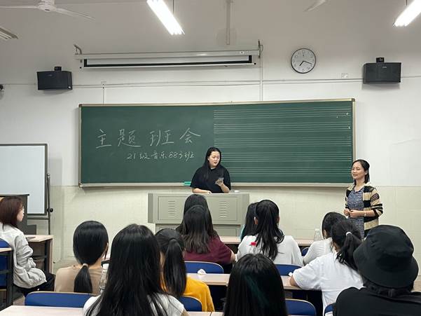 2022年5月4日晚上七点,音乐教师教育组组长兼21级883音乐班班主任刘婧博士在音乐楼208教室召开了主题班会活动。刘老师就音乐教育专业、未来职业发展规划、大学四年学习计划等问题,与同学们展开深入了交流。同时,同学们也表达了她们对于英语、和声、舞蹈等科目学习的困惑与挑战。大家就如何建立学习帮扶小组展开了初步地讨论。