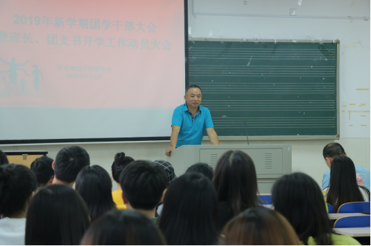 9月1日下午三点,学院新学期学生干部大会在艺术楼303教室召开,学院团总支、学生会、青年志愿者协会全体学生干部以及各班班长、团支书参加会议,学院党总支书记谭顺来、副书记谭小红以及全体辅导员出席会议。学工办主任邓志刚主持会议。