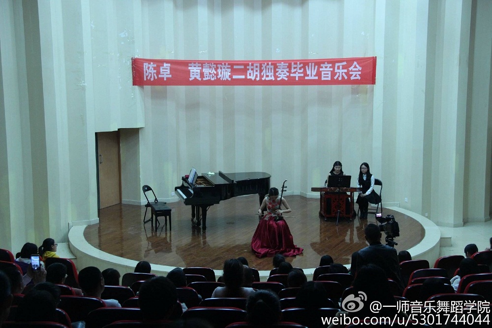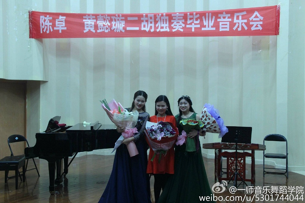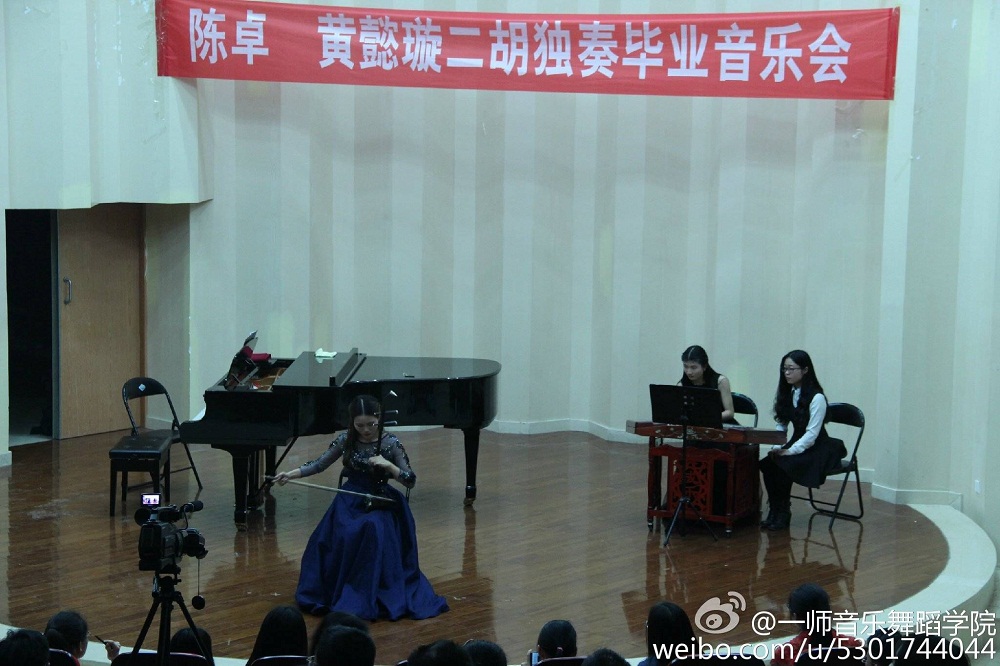 2016年5月9日晚7:00,我院2012级610班陈卓和黄懿璇同学的二胡独奏毕业音乐会在音乐厅成功举办。本次音乐会评委为杨丹、周颖、毕琼文等三位老师。