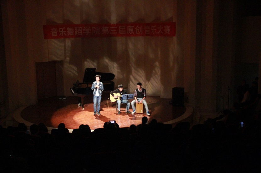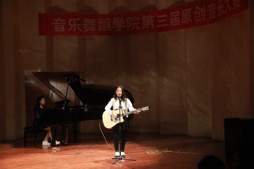 比赛中间穿插有晨曦音乐社的友情演出,为比赛增彩添色。最终,14级音本1班的李晓东同学以一首原创的英文歌曲《Gift》拿到了本届比赛的一等奖。13级音本1班的钟甜以《一个人去大理》和13级音本2班的张环《秋天来了》荣获二等奖。