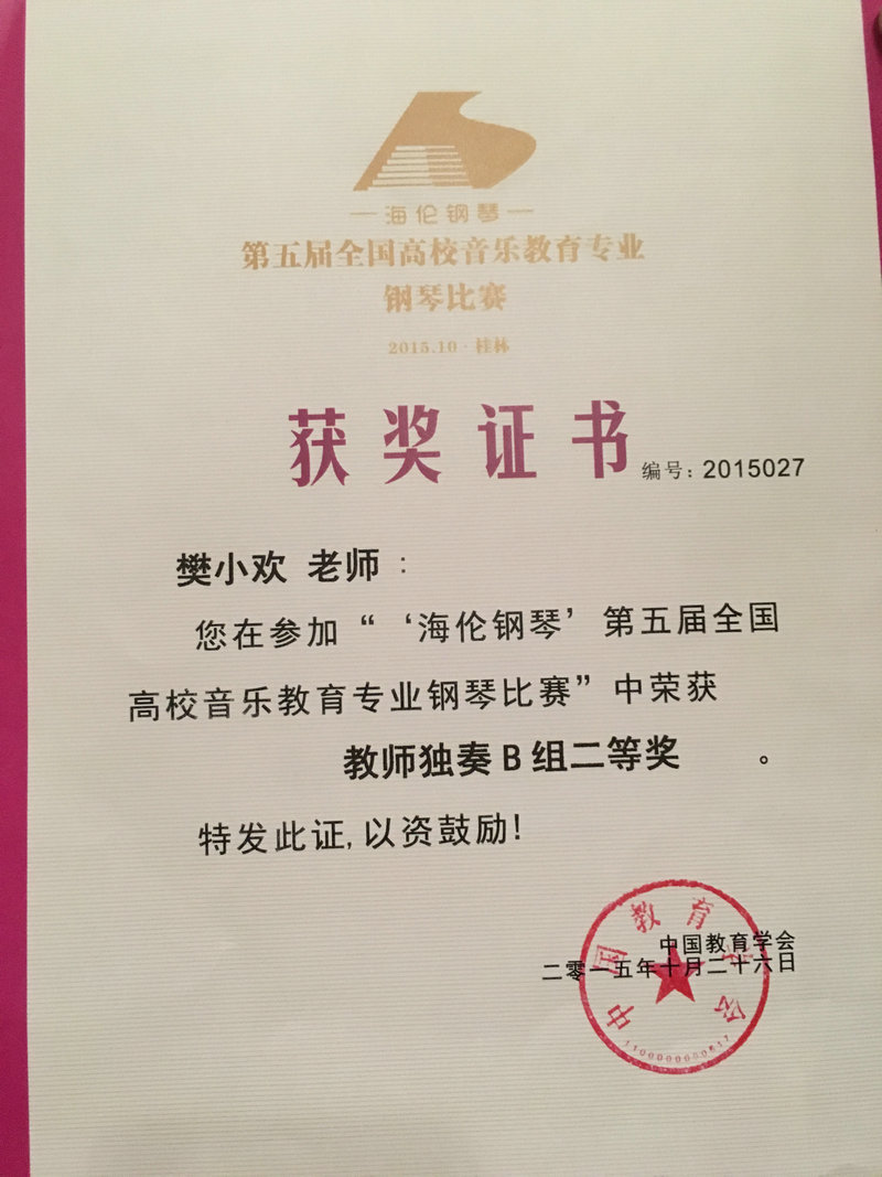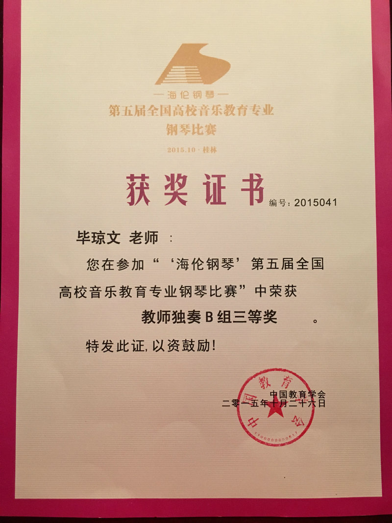 本届比赛分为教师独奏、教师双钢琴演奏、研究生独奏、研究生伴奏四个组别。我院选派了四名教师参加比赛,并全部获奖。在教师独奏B组的比赛中,樊小欢老师获二等奖,毕琼文老师获三等奖,谭娜老师获优秀奖;在双钢琴演奏的比赛中,吴易颖老师与毕琼文老师、谭娜老师与樊小欢老师合作的双钢琴演奏均获得优秀奖。