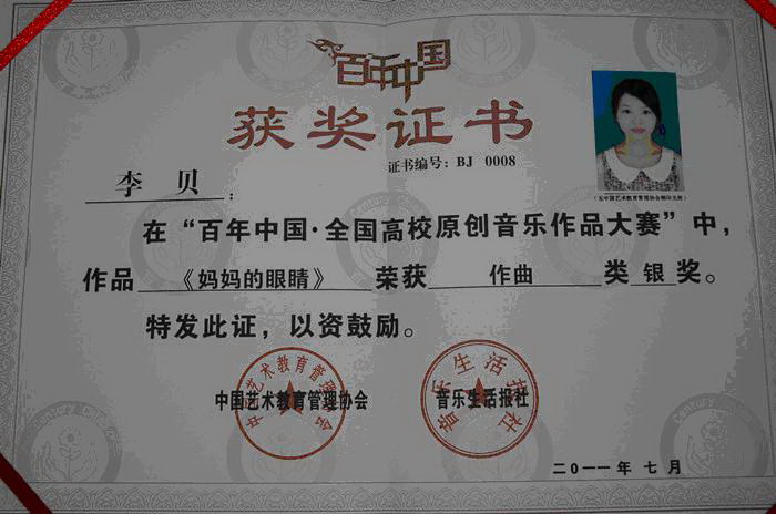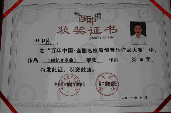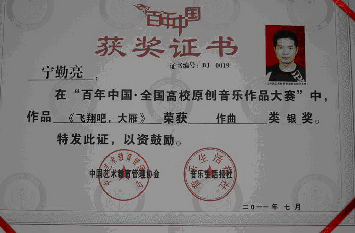 7月28日,“百年中国•全国高校原创音乐作品大赛”在北京举办。我系宁勤亮老师,20 08级学生尹卫刚、李贝两位同学的参赛作品经过初赛和决赛从中脱颖而出。其中,宁勤亮老师的男声四重唱作品《飞翔吧,大雁》获教师组银奖;尹卫刚钢琴作品《回忆变奏曲》及李贝同学声乐作品《妈妈的眼泪》均获得学生组银奖。