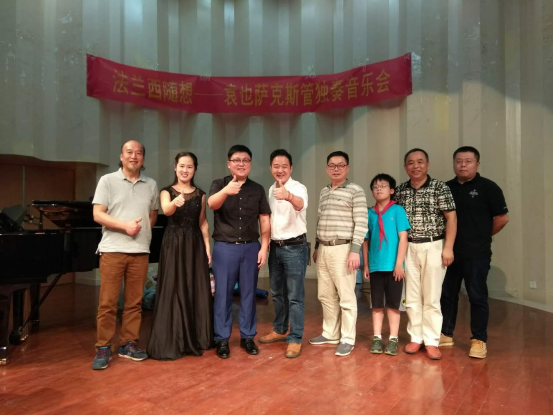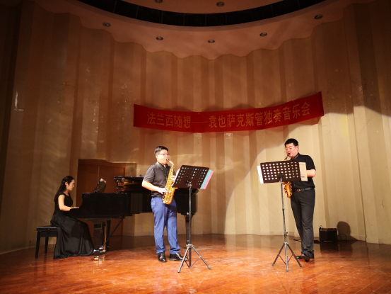 2018年6月6日晚上7点30分,我院袁也老师在音乐舞蹈学院曼伦音乐厅成功举行“法兰西随想”萨克斯管独奏音乐会。音乐会当晚到场的嘉宾有:院党支书记谭顺来、院长李小君、副院长廖小芒、副院长张应华、湖南省管乐协会副会长石长俊、湖南省萨克斯学会副会长王志强以及院部分教师。