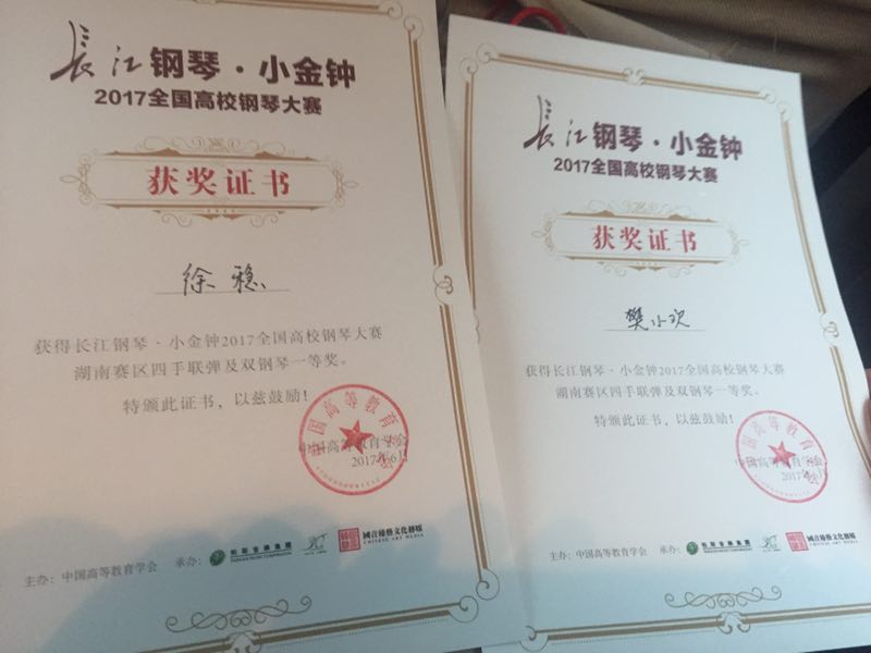 6月24日,由中国高等教育学会主办的“长江钢琴·小金钟2017全国高校钢琴大赛”湖南预选赛在湖南师范大学音乐学院落下帷幕。我院教师樊小欢与徐稳老师合作参加了此项赛事的四手联弹及双钢琴组比赛,最终两人以优异的表现荣膺该组金奖(第一名)。