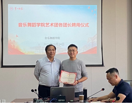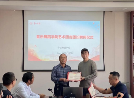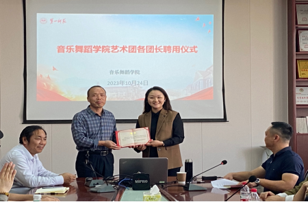 2023年10月24日下午,音乐舞蹈学院举行了新一届艺术团团长与分团团长聘任仪式。张应华院长、谭小红副书记、刘炜副院长与各系正副系主任、艺术团与分团团长、青年教师代表出席了会议,刘炜副院长主持会议。