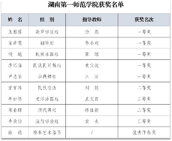 2023年12月12日,湖南省教育厅正式发文公布湖南省第十一届本科院校音乐舞蹈本科专业学生“独唱独奏独舞”比赛获奖情况。我校音乐舞蹈学院选送学生在与来自全省各市州24所本科院校近300名选手的激烈角逐中,斩获5个一等奖、3个二等奖、1个三等奖的佳绩,创历史新高。一等奖总数居全省高校(本科组)第四名,较上届比赛稳中有进,保持了学校在该赛事中第一梯队的高水平。