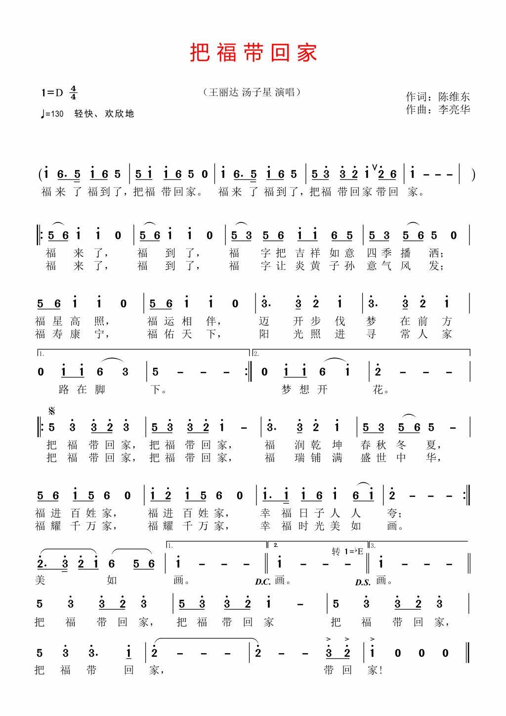 作曲作品:《把福带回家》李亮华作曲、陈维东作词、王丽达汤子星演唱