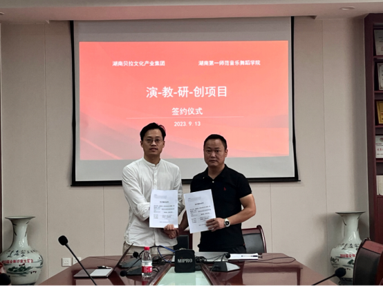 2023年11月27日为了优化教研结构,推进人才培养,9月13日上午,湖南第一师范学院音乐舞蹈学院与湖南贝拉文化产业集团在鹤鸣楼504会议室签订“演教研学”项目合作协议。音乐舞蹈学院党委副书记谭小红、副院长刘炜...